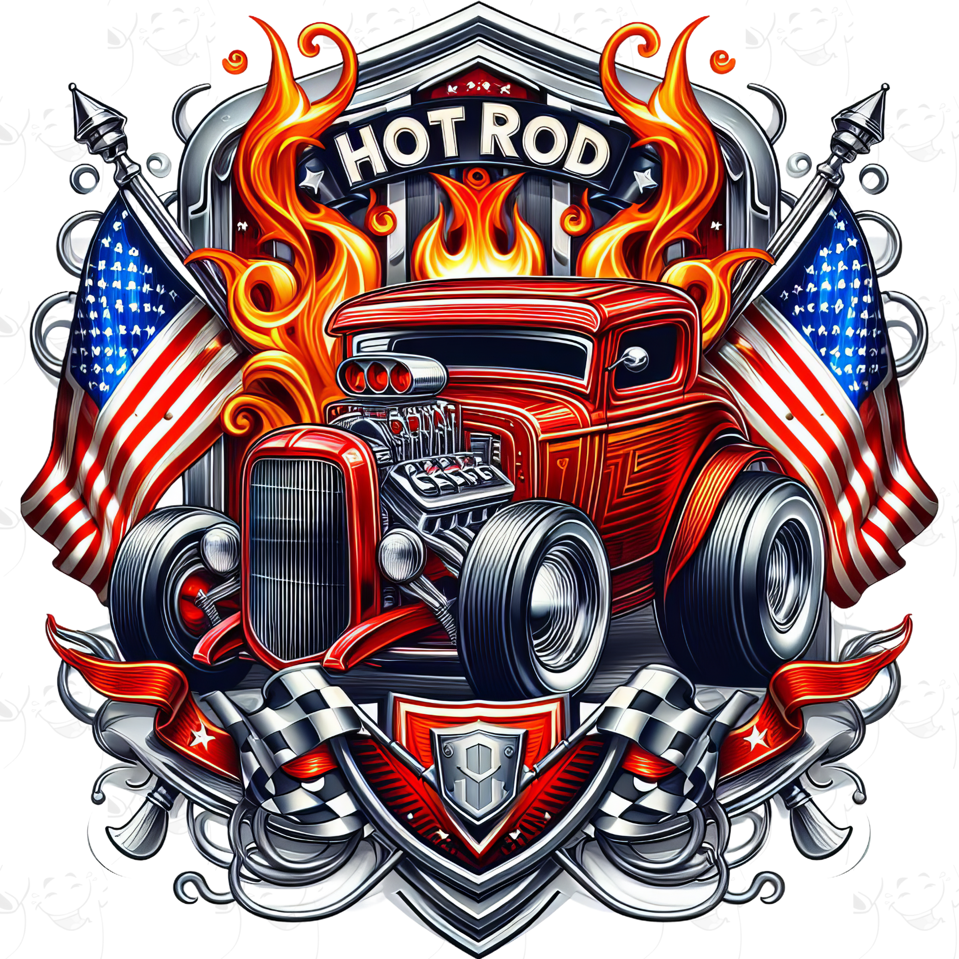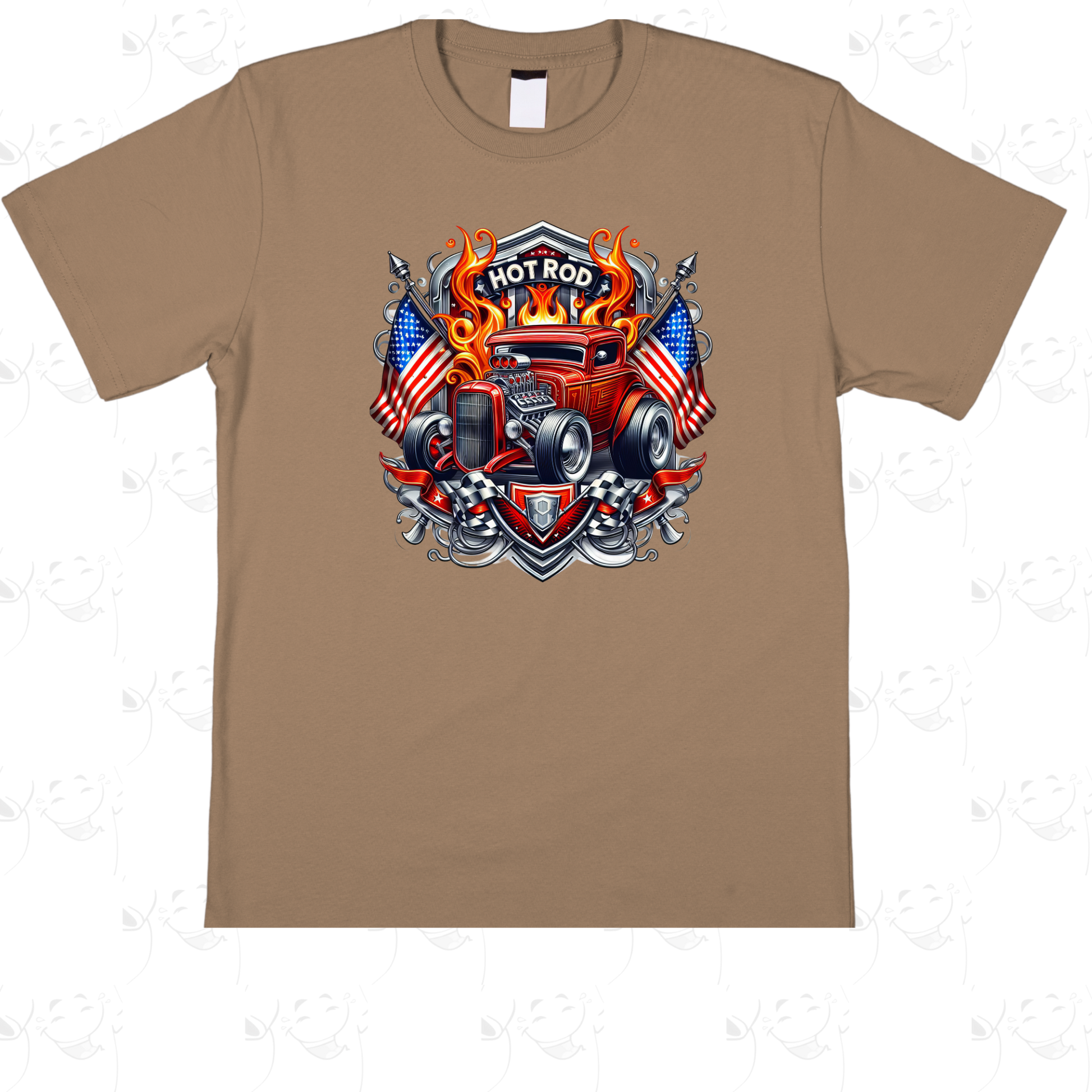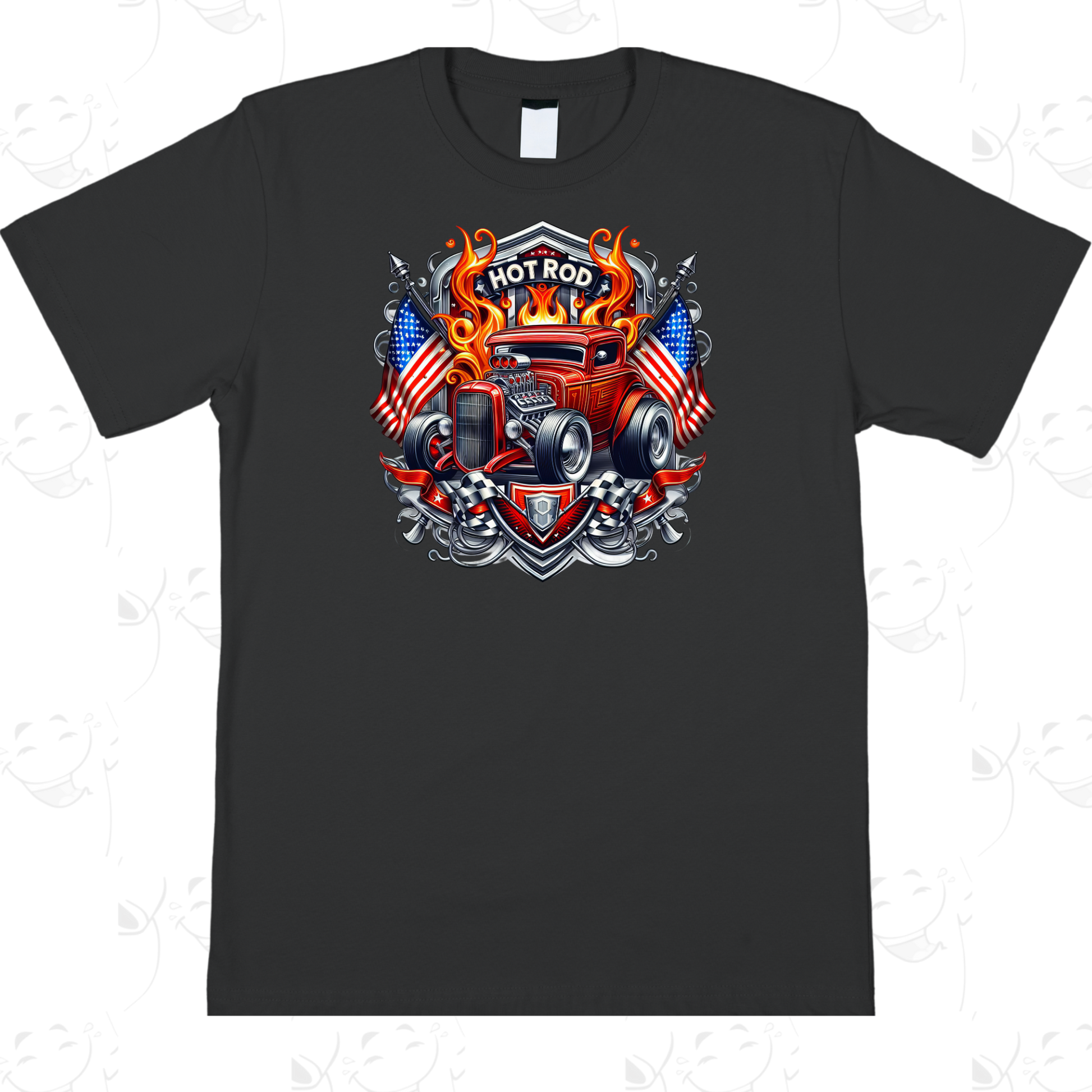 Feel the speed with the Hot Rod Flame Racer Tee. Featuring a blazing hot rod with roaring flames, this bold design captures the thrill of the open road. Perfect for car enthusiasts who live life in the fast lane.