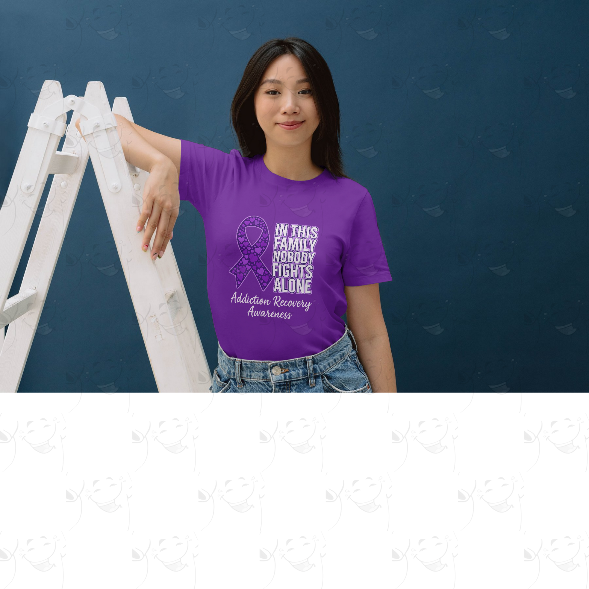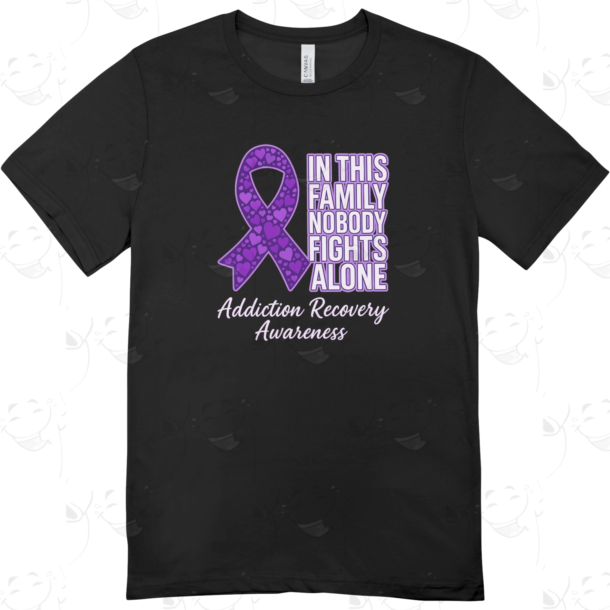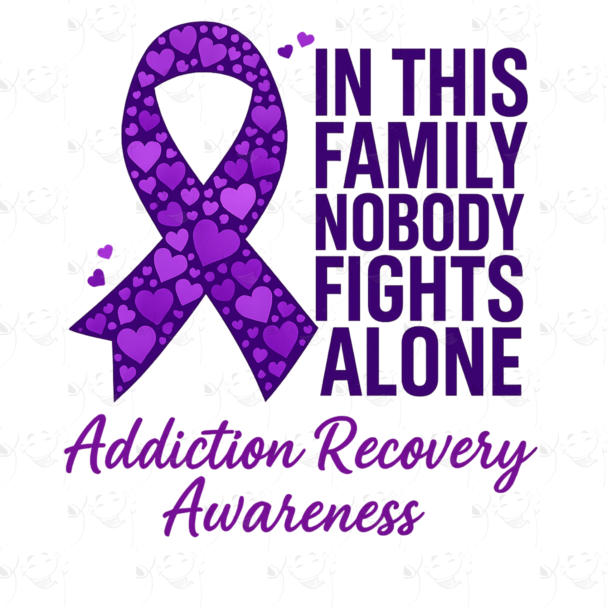 Show strength, love, and unity with the In This Family Nobody Fights Alone recovery awareness tee. Featuring a bold purple ribbon filled with hearts and the powerful words “Addiction Recovery Awareness,” this shirt represents hope, solidarity, and the reminder that nobody has to face the journey alone.